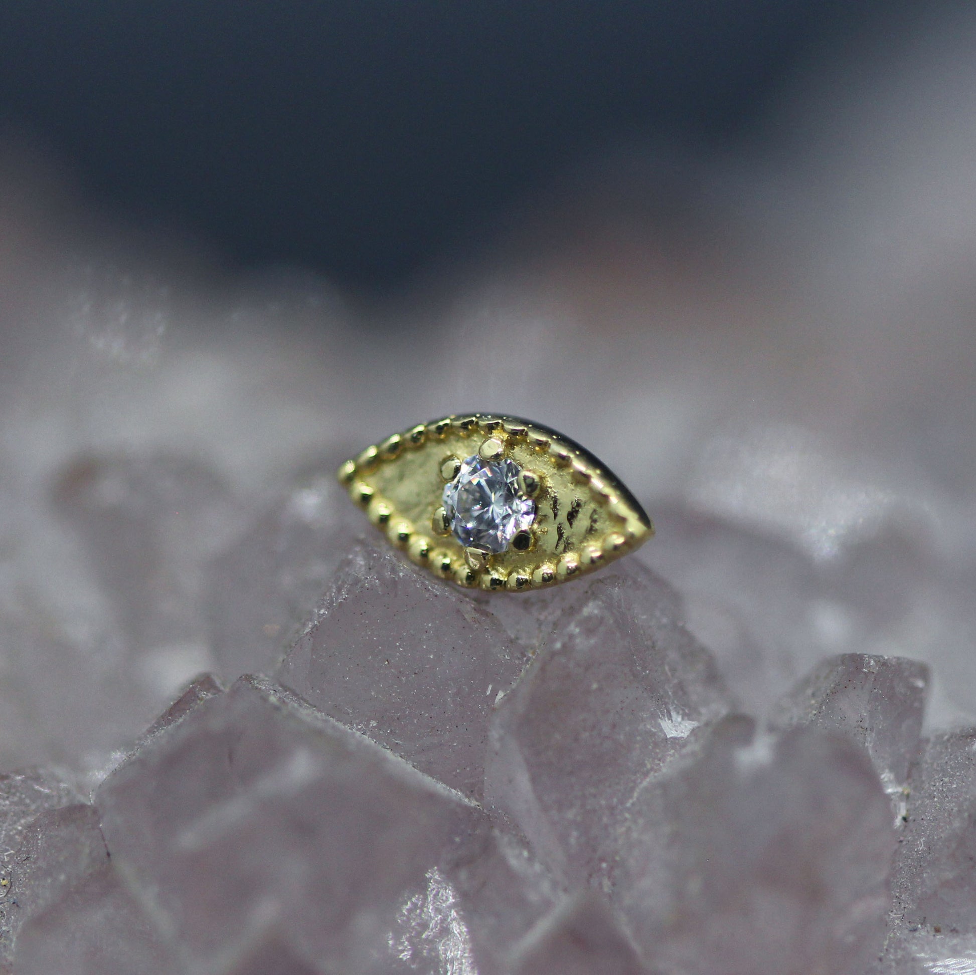 The Anatometal Fortuna Threadless End is expertly crafted from 18k yellow, rose, or white gold and features a clear cubic zirconia set in a distinctive eye shape. Ideal for helix, conch, or philtrum piercings, it also suits a variety of other piercings where a stud can be worn, provided the anatomy allows. This threadless end combines refined elegance with precise fit and durability, making it a versatile and high-quality choice for sophisticated piercing jewelry.