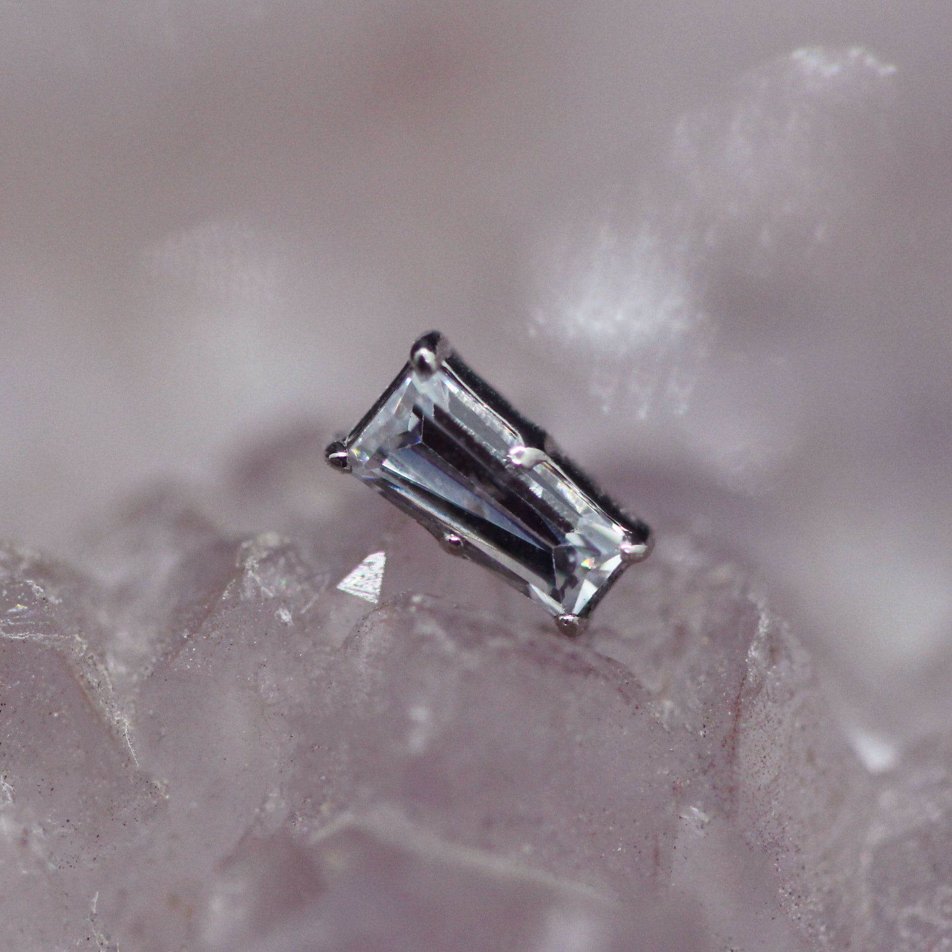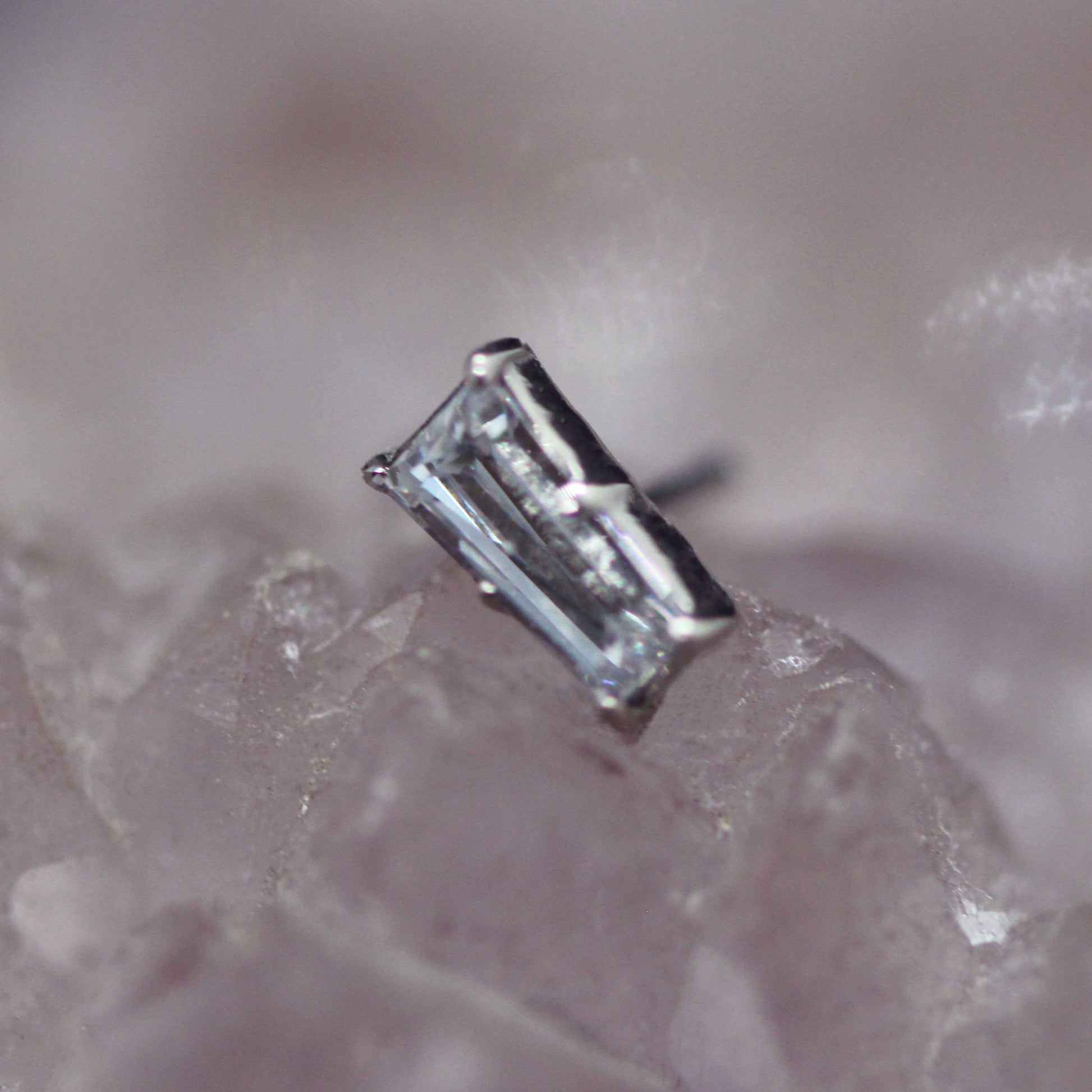 Elevate your piercing collection with this sophisticated threadless end, crafted in your choice of 18k yellow, rose, or white gold. Featuring a tapered prong-set baguette-cut cubic zirconia, this piece delivers refined sparkle with architectural elegance. The streamlined design makes it versatile enough for most initial piercings where traditional studs are worn, offering both versatility and timeless appeal for everyday wear or special occasions.