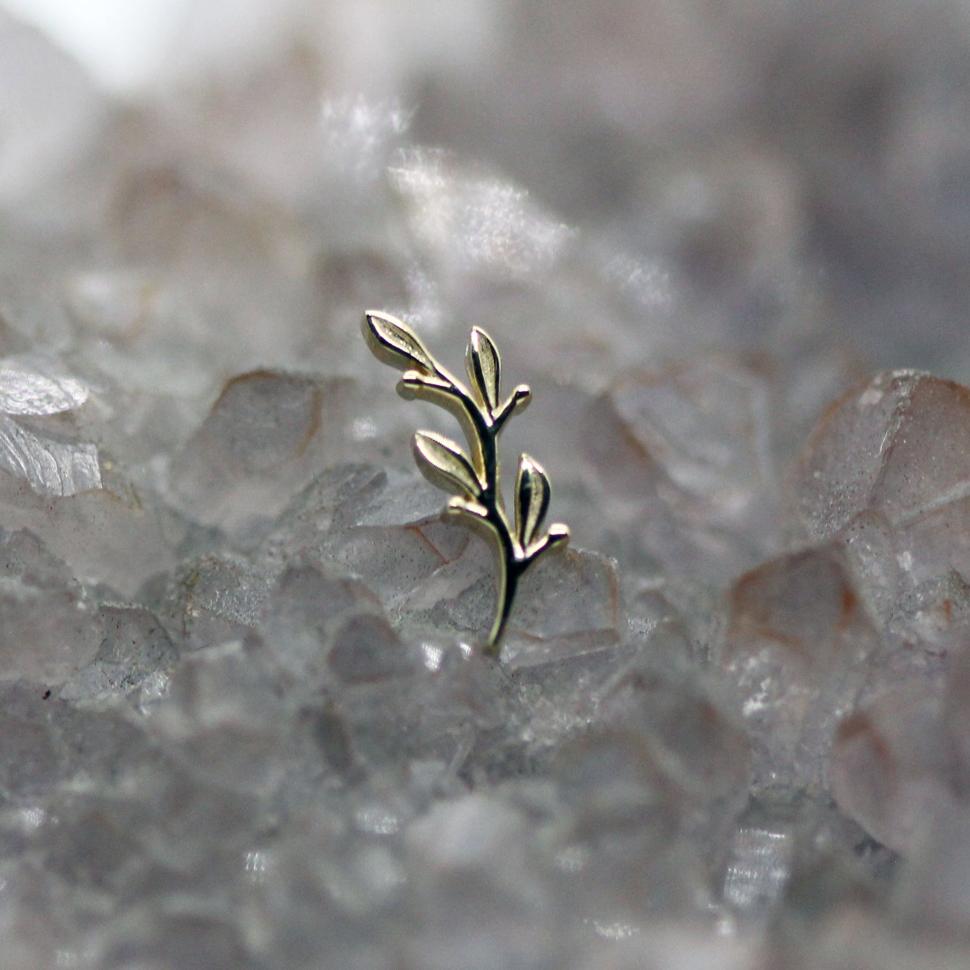 Crafted from 14k yellow gold, the BVLA Tiny Amity Threadless End features the brand’s signature branch design, elegantly curving to the right or left. This delicate piece measures a precise 2.5mm by 7mm, making it the smallest size available. Its threadless construction ensures a secure, seamless fit, perfect for subtle, refined body jewelry enhancement.