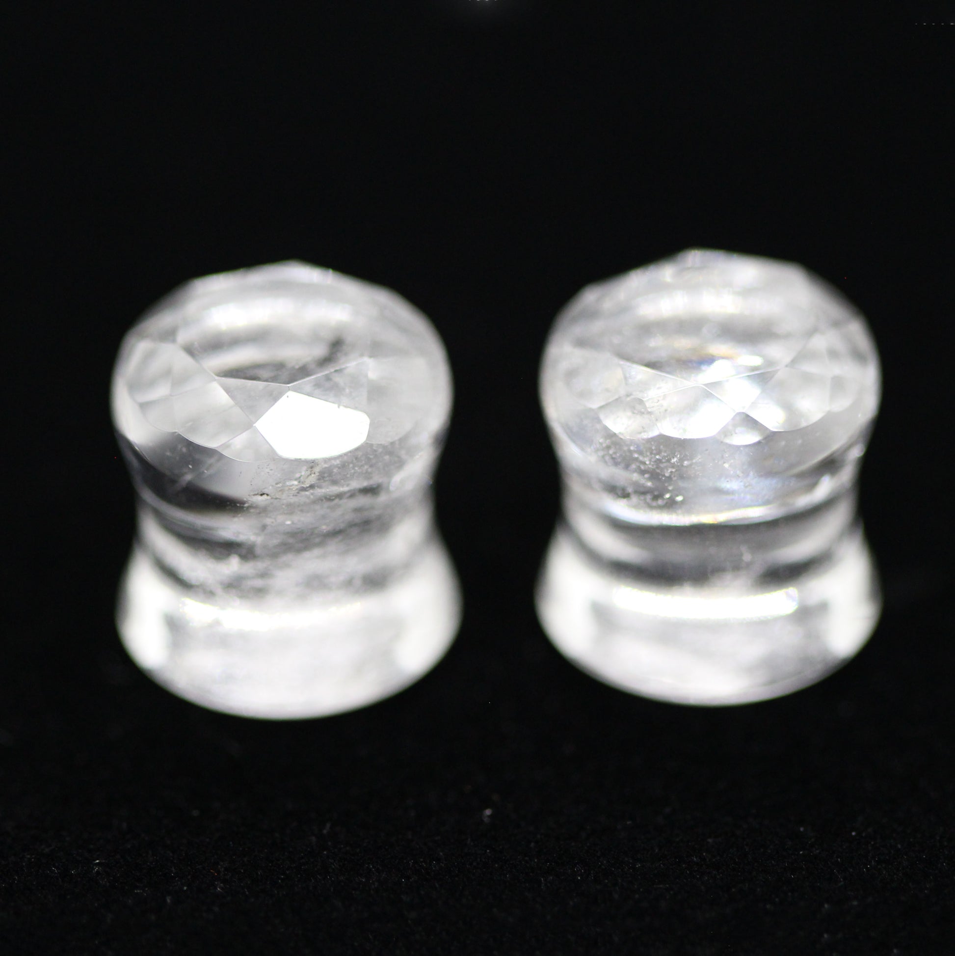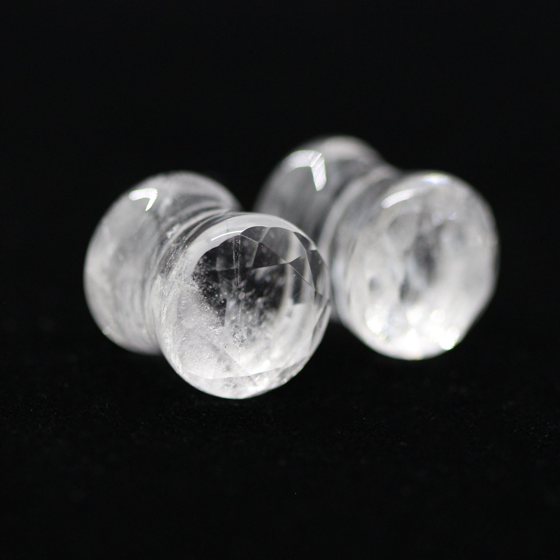 Distinctive clear quartz plugs featuring a meticulously faceted gem-cut surface with natural inclusions that render each piece uniquely individual. The wear surface progresses from 8mm to 11mm as gauges increase, and the double flares provide secure retention and ergonomic comfort for all-day wear. Each plug's one-of-a-kind mineral characteristics—subtle inclusions and clarity variations—ensure no two pieces are identical, offering collectors authentic geological authenticity. Clear quartz's natural hardness preserves the faceted brilliance over time, making these plugs a sophisticated choice for those valuing both mineralogical uniqueness and precision engineering.