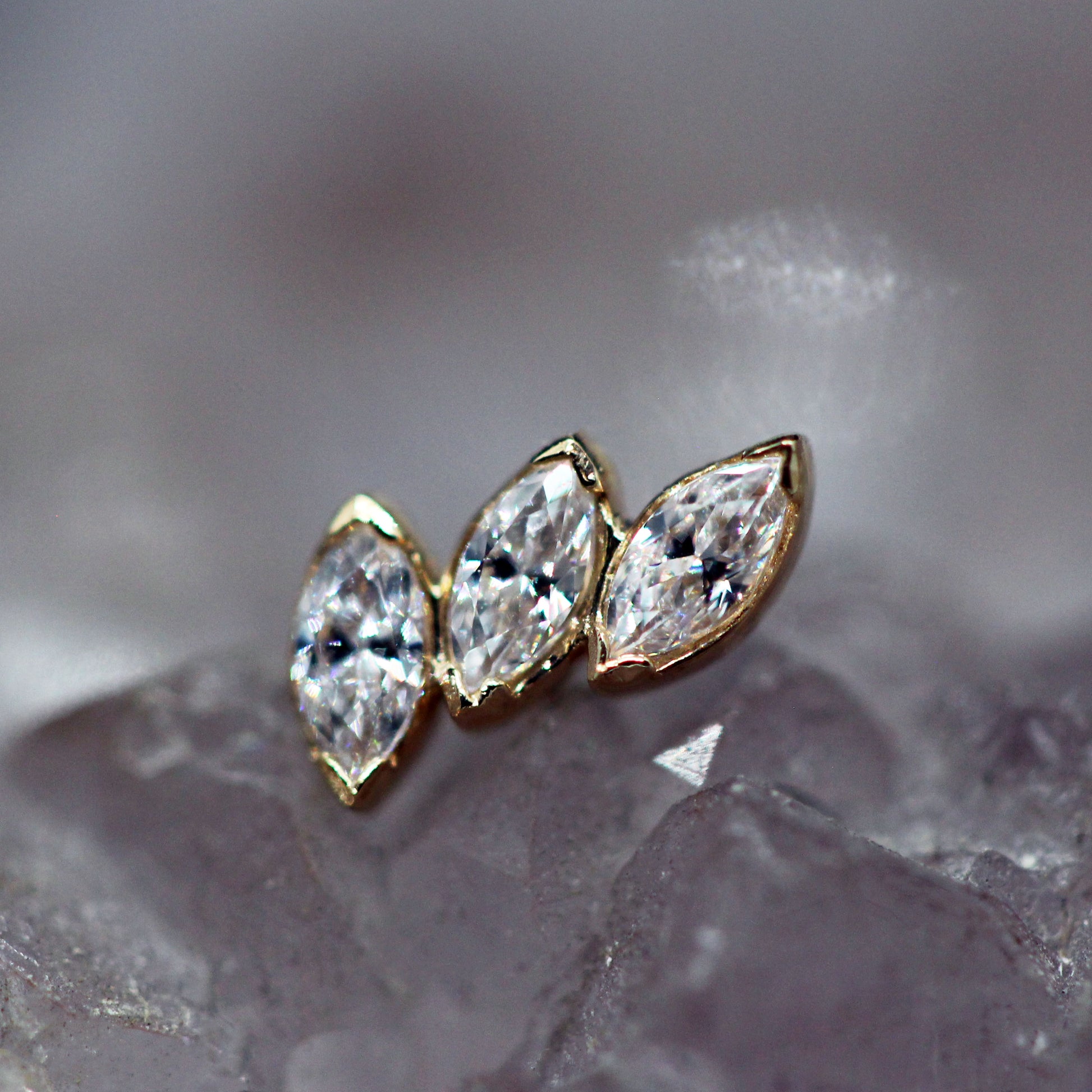 The Fanfare Threadless End features a sophisticated marquise-cut cubic zirconia cluster in 18k yellow gold, arranged in a dynamic fan formation oriented right or left to suit your aesthetic. The three-gem configuration works beautifully across initial piercings, while the five-gem option provides enhanced visual impact ideal for helix or conch placements where anatomy permits. A versatile choice for those seeking refined sparkle with directional styling flexibility. The three gem option measures 3.5mm x 6.5mm top to bottom, and the five gem option measures 4mm x 10mm.