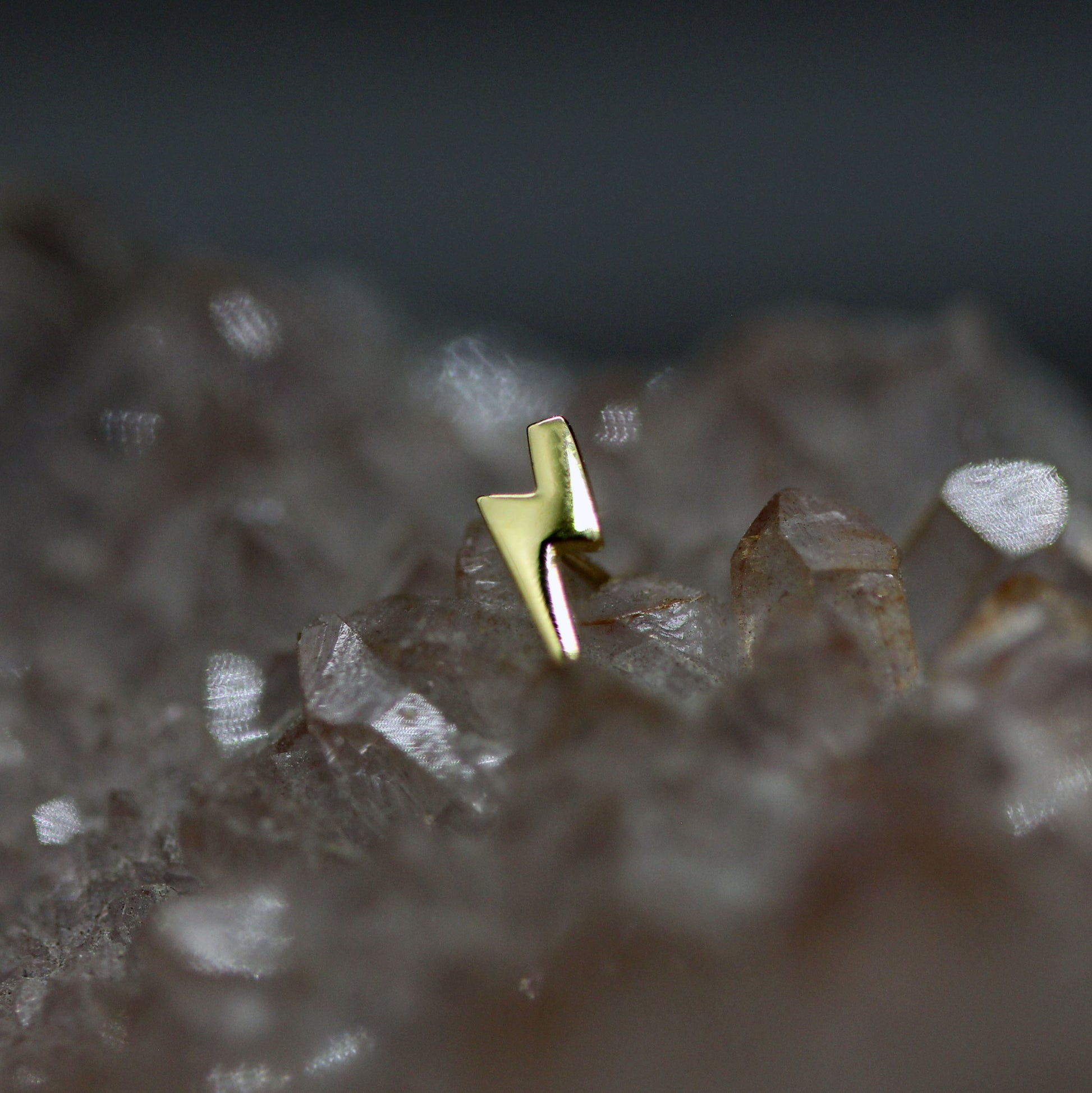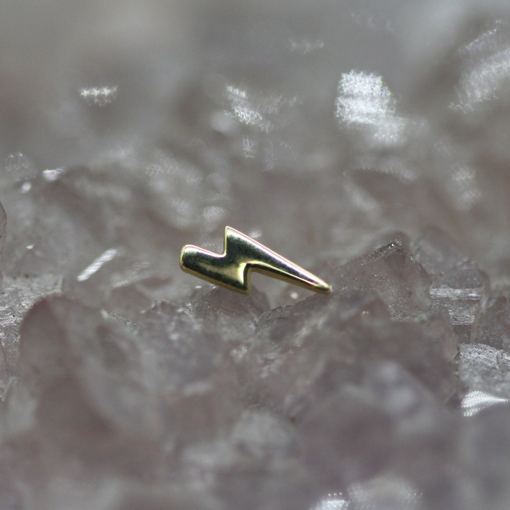 Crafted from 18k yellow gold, the Lightning Bolt Threadless End offers versatile styling with two directional options to suit your placement preferences. Designed for initial piercings requiring a stud, this piece combines expert quality with a sleek, modern aesthetic to ensure both comfort and lasting wear.