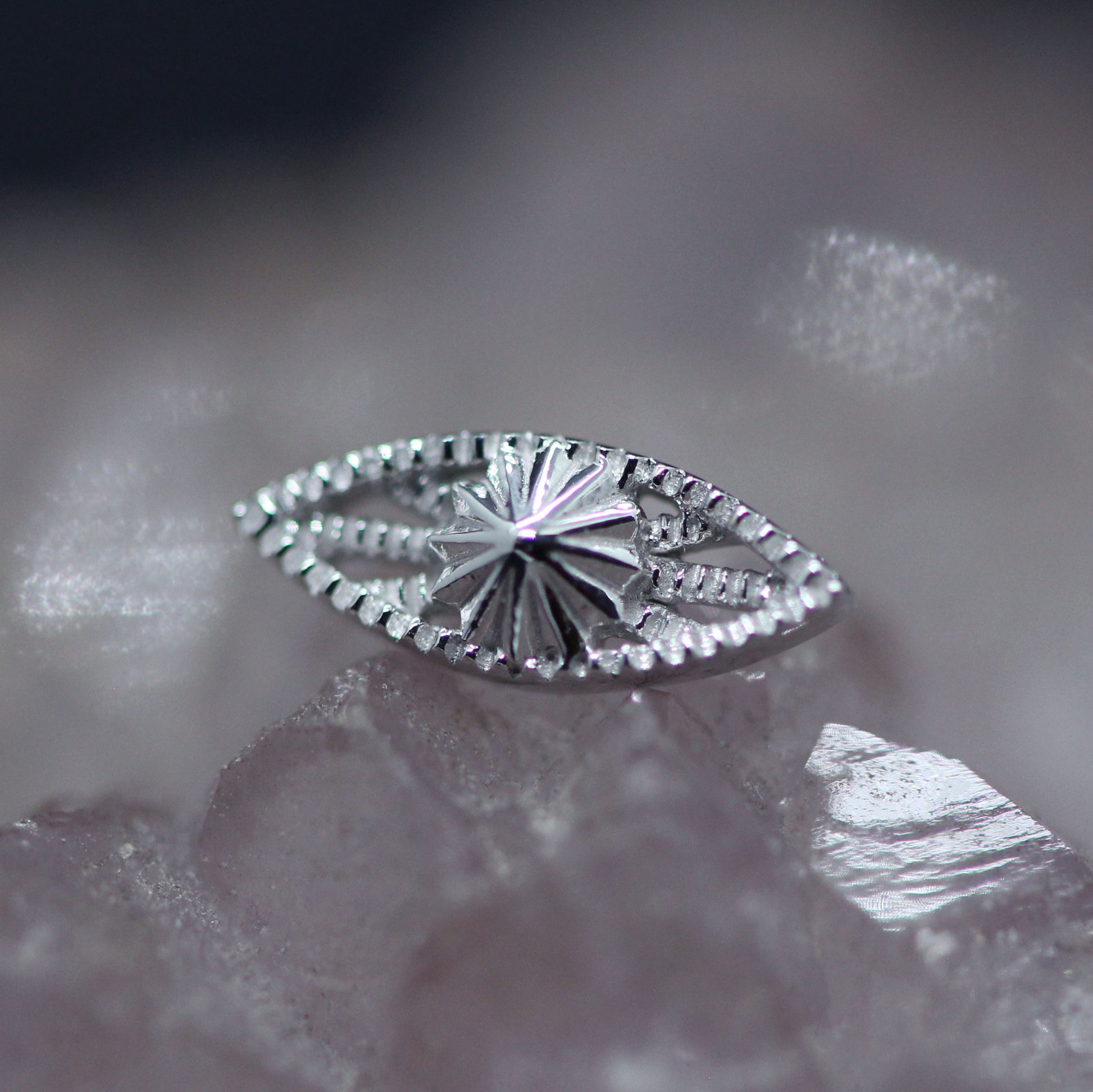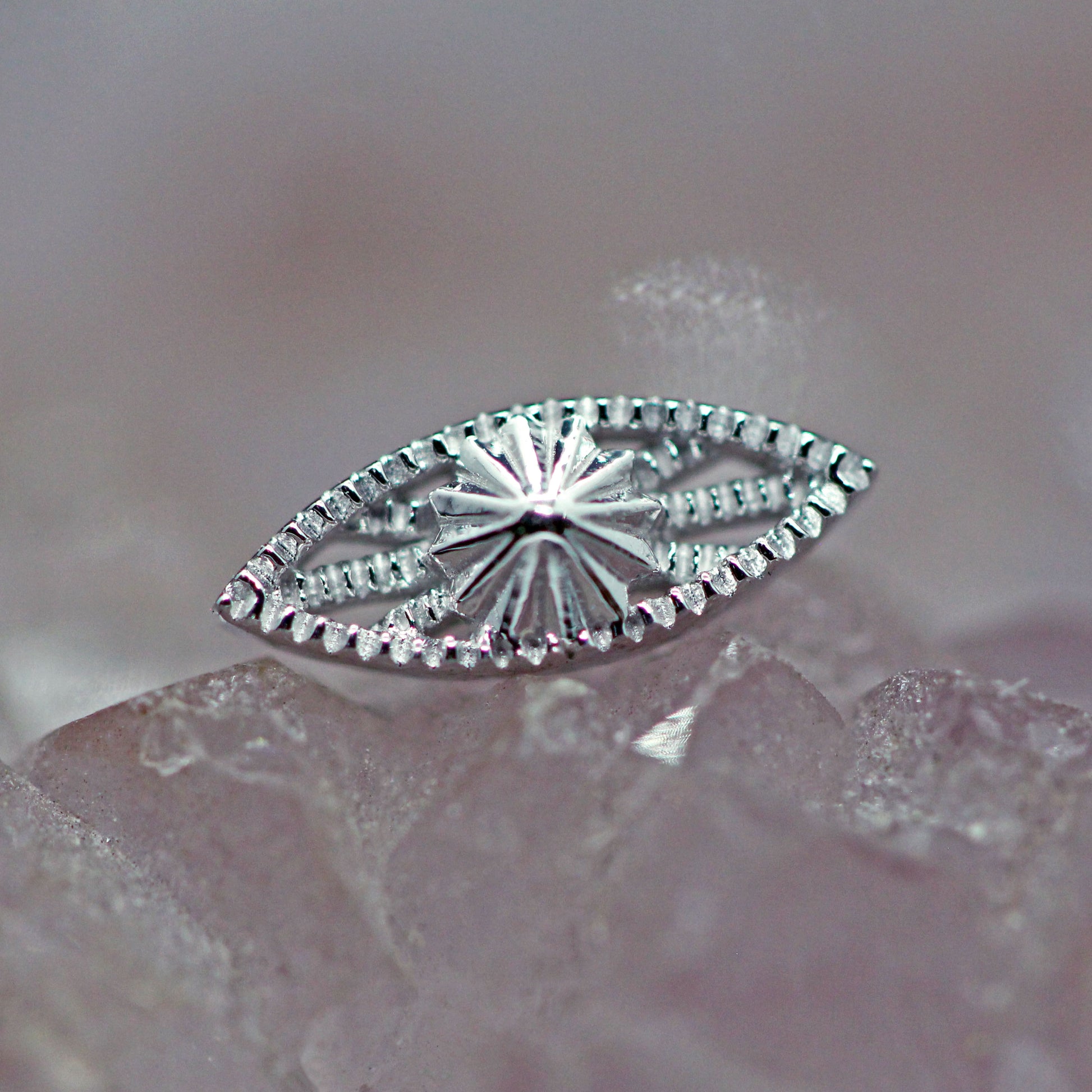 Crafted from solid 14k white or yellow gold, this threadless end features an intricately detailed ellipse design that masterfully employs negative space for visual sophistication. Versatile enough for initial piercings or healed placements where a stud is appropriate, it accommodates various piercing anatomy and jewelry configurations. The precision engineering ensures secure, comfortable wear while the refined aesthetic elevates any piercing collection.