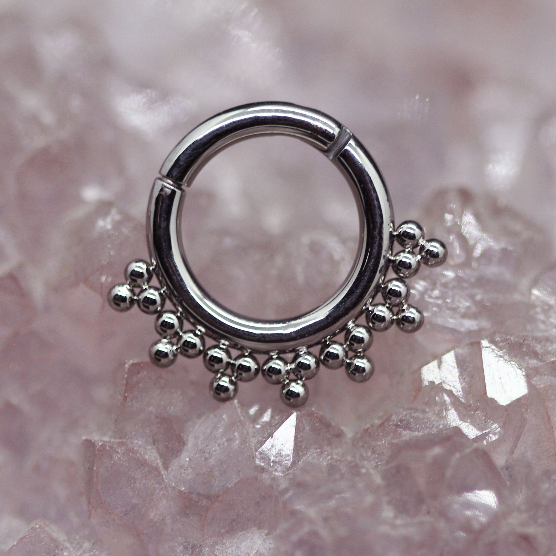 Handmade by Dysmorphic in Lyon, France, this titanium clicker merges functional design with artistic embellishment through carefully placed beaded accents. The biocompatible titanium construction minimizes irritation risk, making it an excellent choice for healed piercings. Available in both 16g and 14g with two inner diameter options, you can select the precise specifications your piercing requires. The clicker mechanism delivers smooth, reliable movement while the artisanal beadwork adds visual sophistication. A versatile piece that balances technical performance with refined craftsmanship.