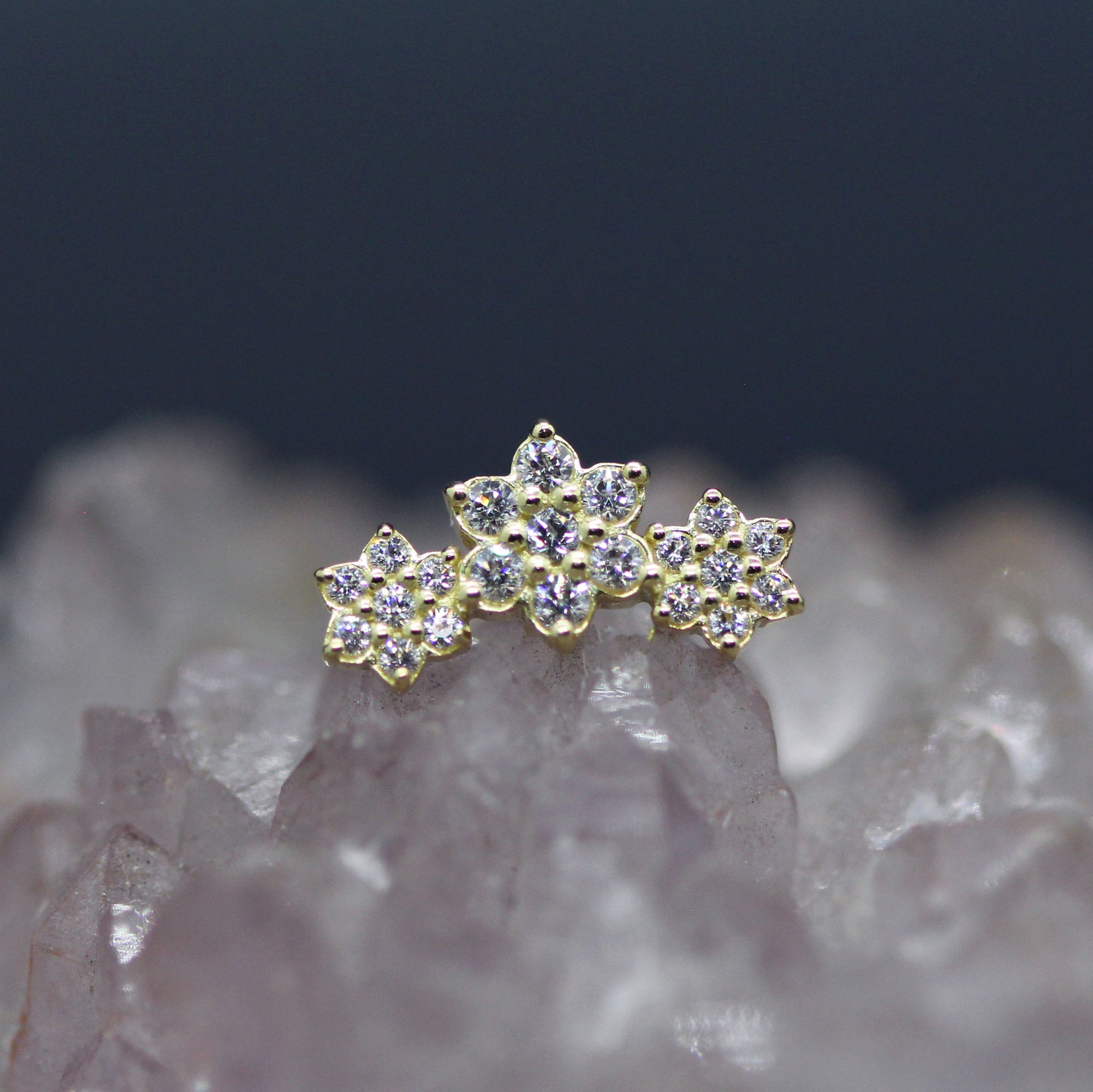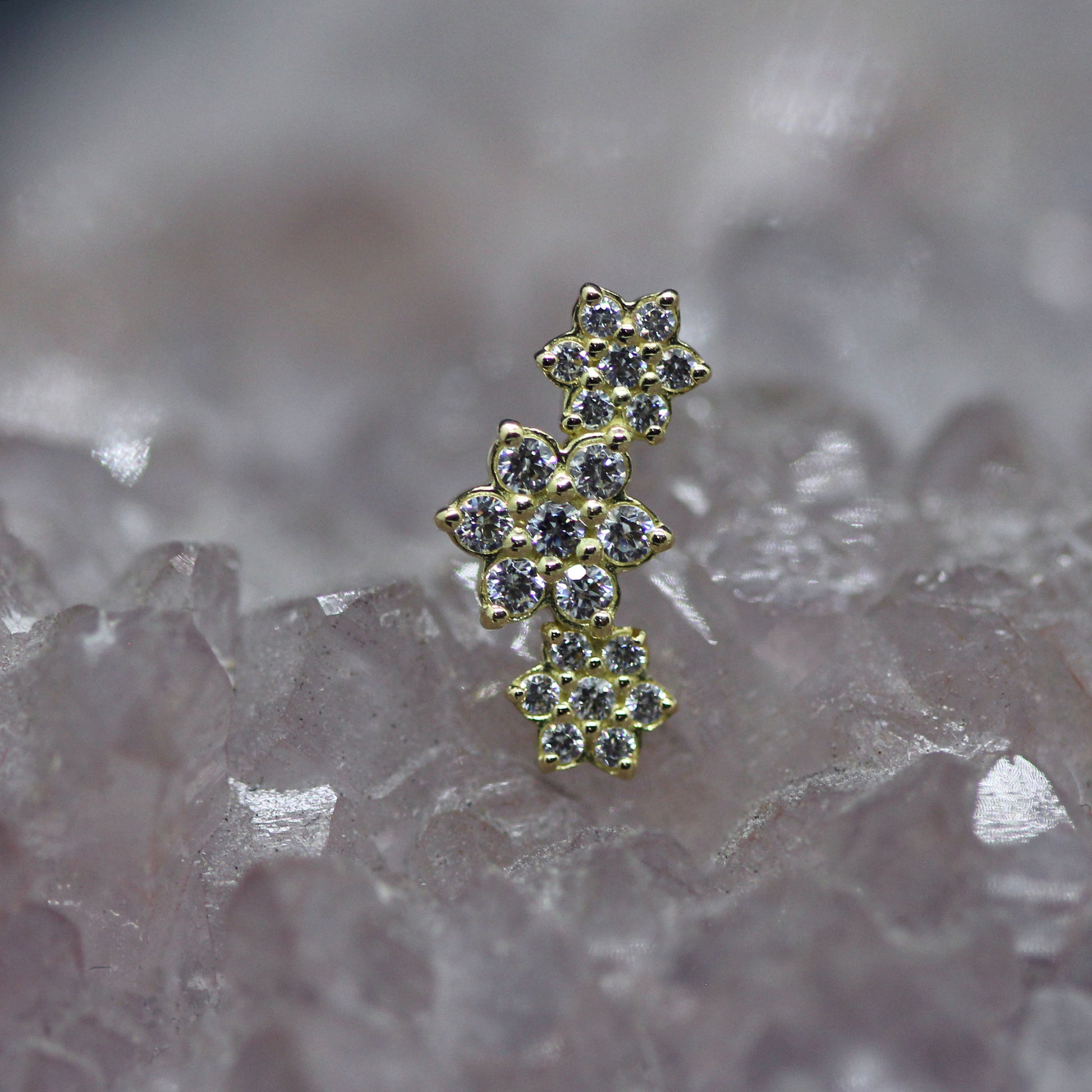 Crafted from 18k yellow gold, the Triple Flower Threadless End features three flower-shaped clusters of clear cubic zirconia arranged in a gentle 11mm arc. This design is ideal for helix piercings but can also be worn in conch piercings if anatomy permits, as well as other initial piercings suitable for studs. Combining elegant detail with a secure threadless fit, it offers a refined option for both healing and everyday wear.
